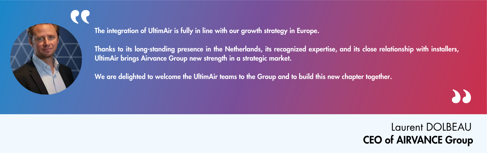 Based in the Netherlands, UltimAir benefits from strong local roots and a long-standing close relationship with installers. Its distribution expertise complements the existing know-how of Airvance Group, thereby strengthening the Group’s overall performance and its ability to support its customers across Europe.